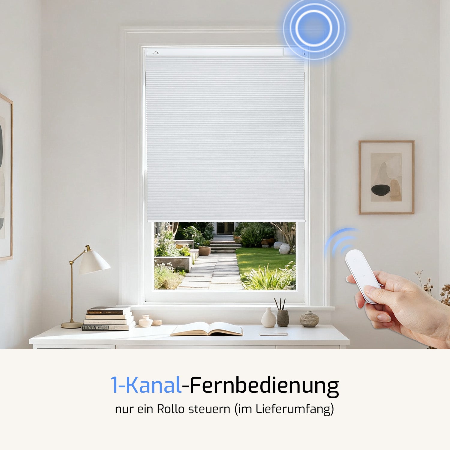 - 1-Kanal-Fernbedienung (im Lieferumfang enthalten): Steuern Sie einzelne elektrische Plissees mühelos mit der mitgelieferten Fernbedienung.