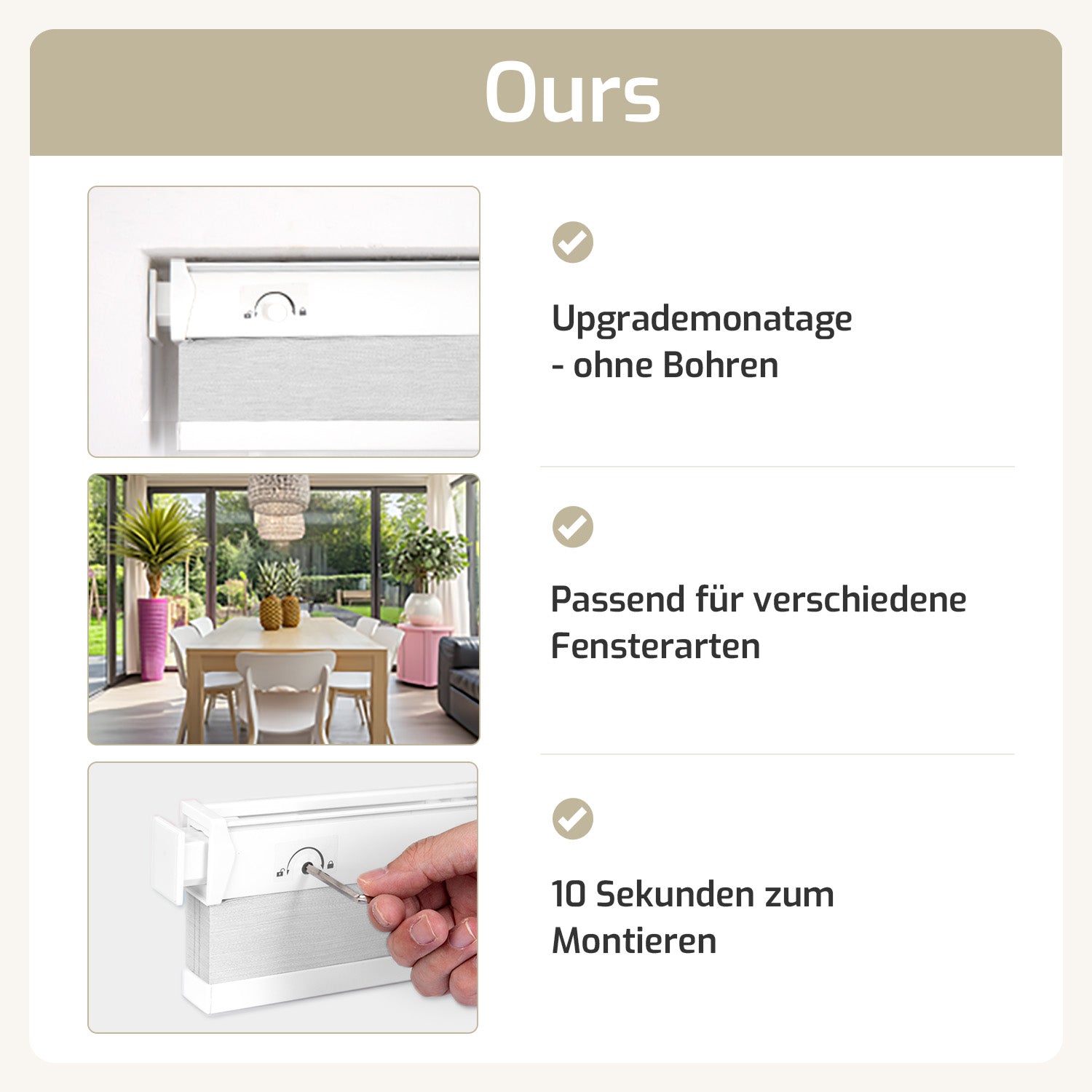 - Solarzellenaufladung (optional): Umweltfreundliche Option, die Ihre Jalousien mit Sonnenlicht versorgt. Perfekt für Fenster mit viel natürlichem Licht.