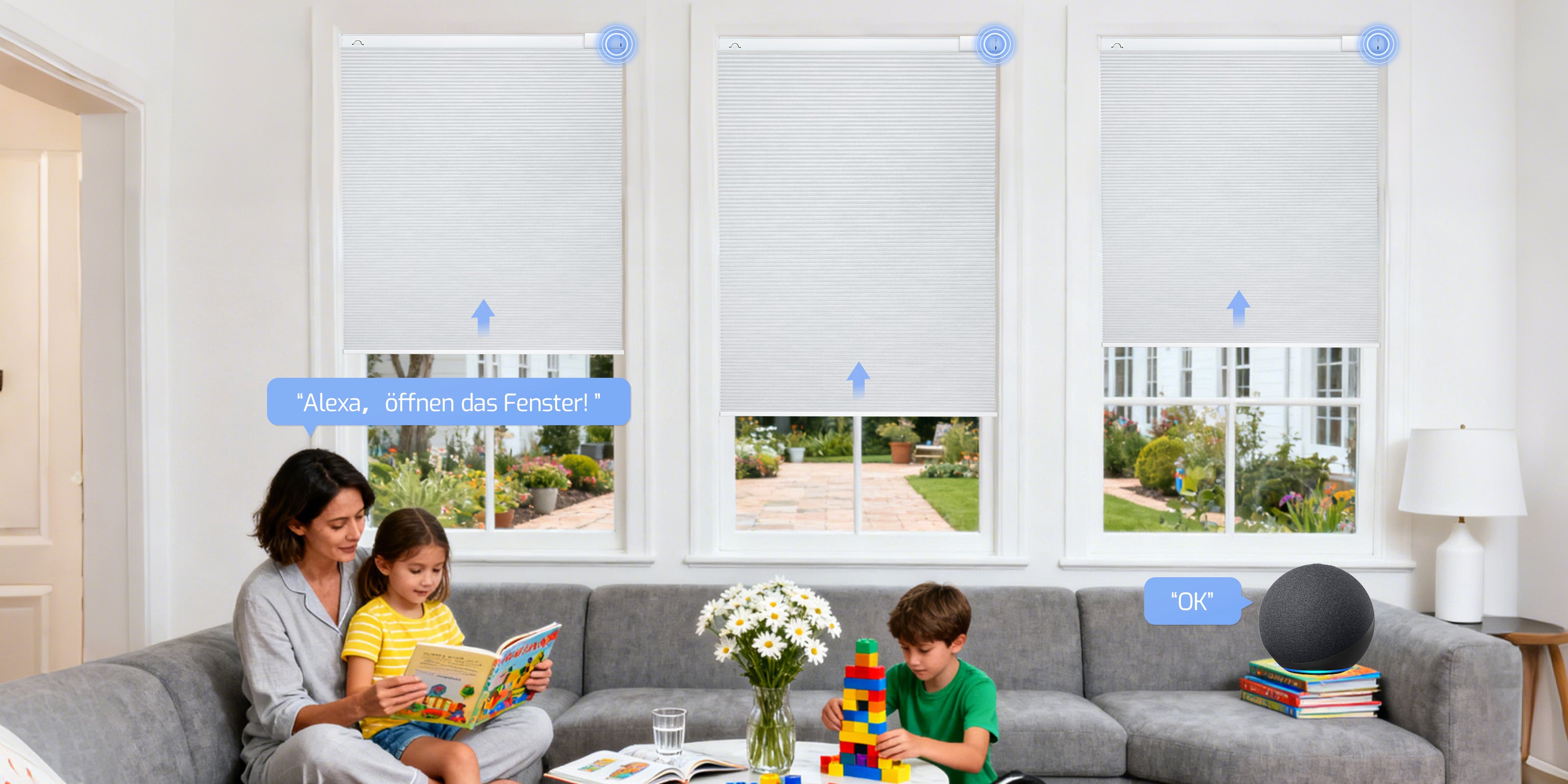 Elektrische Rollos mit Sprachsteuerung für smarte Häuser.