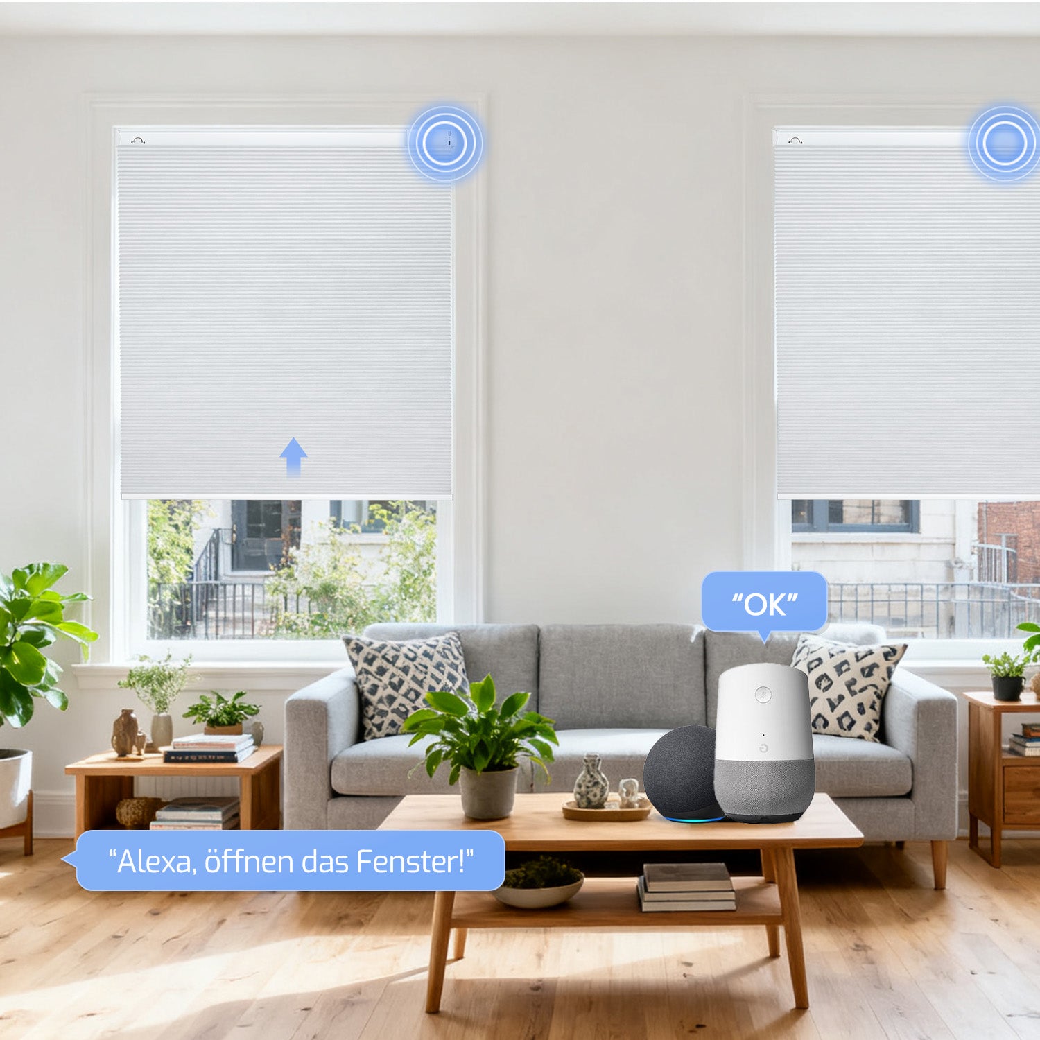 - Smart Bridge (optional): Schöpfen Sie das volle Potenzial Ihrer motorisierten Wabenplissees mit einer Smart Bridge aus. Diese ermöglicht die Steuerung über Ihre SmartLife- oder Tuya-App, Sprachassistenten wie Alexa oder Google Assistant und sogar die Programmierung für automatischen Betrieb. Darüber hinaus ermöglicht die Bridge die Einzelbedienung von bis zu 15 Jalousien und erweiterte Anpassungsmöglichkeiten, wie das Einstellen der Öffnungs-/Schließposition für eine präzise Lichtregulierung.