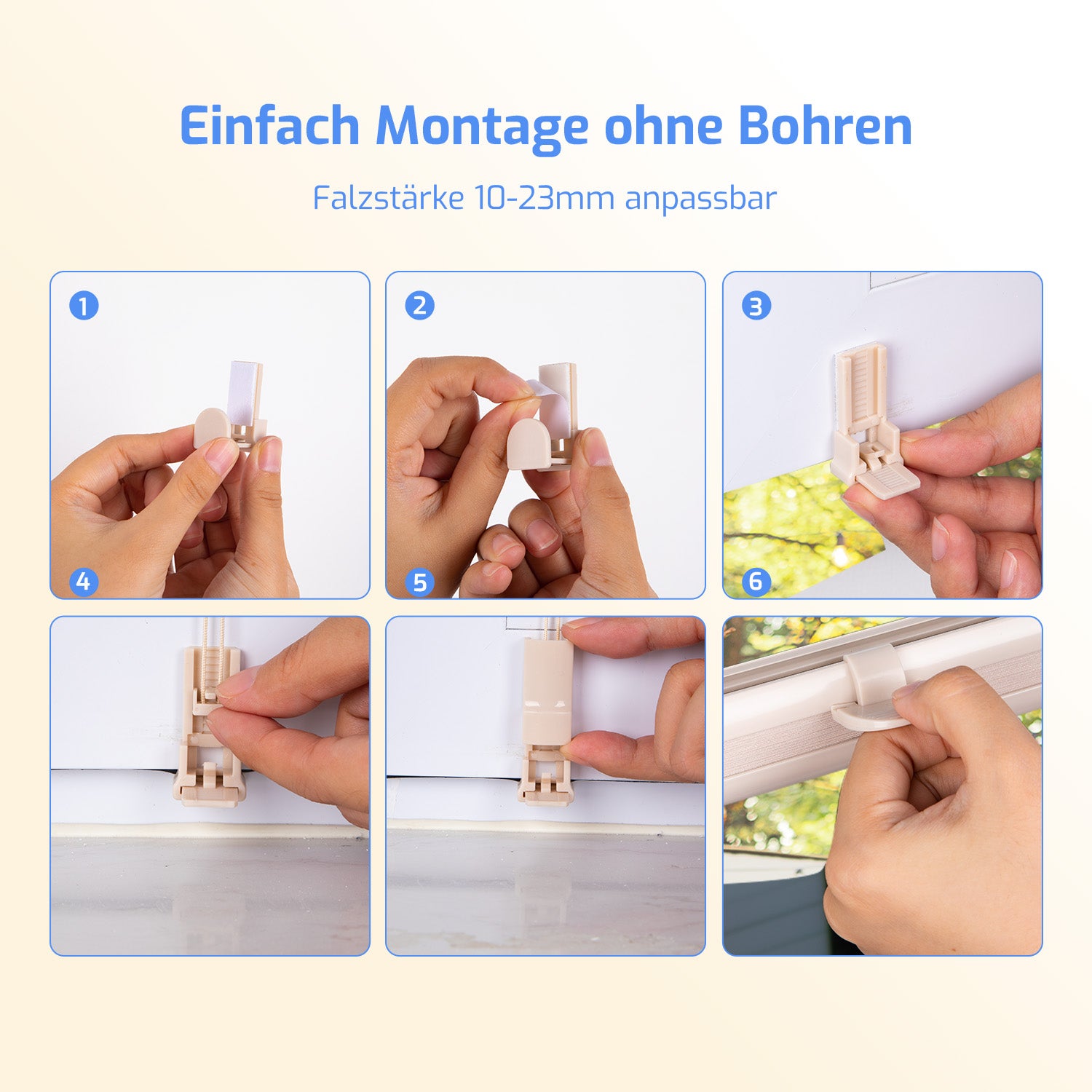 - 【Leicht anzubringen】 Einfache, kinderleichte Montage ohne Bohren – unterstützt durch das mitgelieferte Klemmsystem. Plisee-Halter ohne Bohren beschädigen keine Fenster. Die Halterung ist zudem mit Kleber ausgestattet, um eine sichere Installation zu gewährleisten. Geeignet für Fensterrahmen mit einer Falzstärke von 1,0 bis 2,3 cm (jedoch nicht für Dachfenster!).