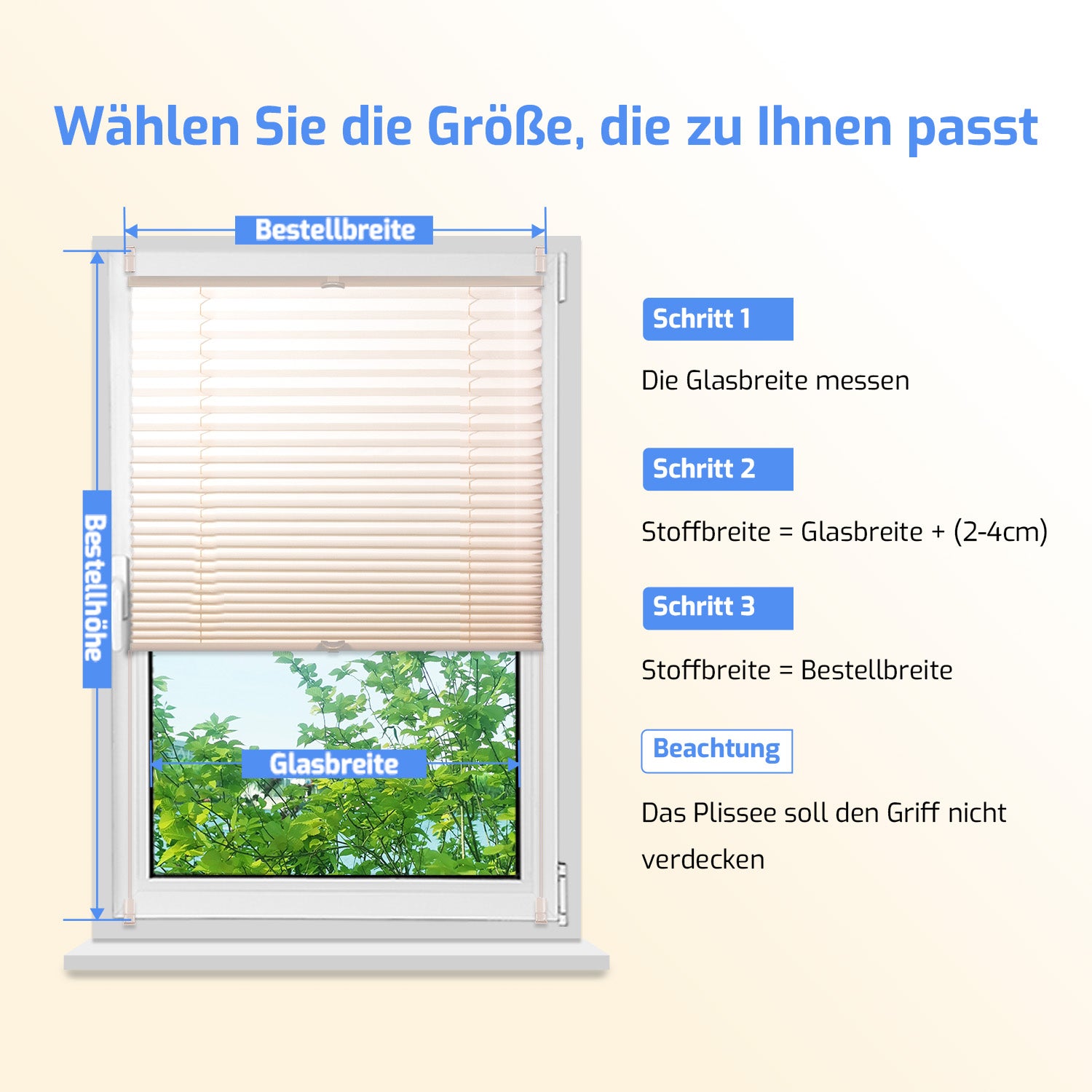 - 【Welche Größe soll ich bestellen?】 Bestellbreite = der Breite der sichtbaren Fensterscheibe. Bestellhöhe stimmt mit der Höhe des Fensterrahmens überein. Je nach Wunsch können Sie bei der Auswahl der Breite auf jeder Seite bis zu 2–3 cm hinzufügen. Zum Beispiel: Wenn die Breite der Fensterscheibe 70 cm beträgt, können Sie 70 + 2,5 + 2,5 = 75 cm bestellen. Beachten Sie jedoch, dass Fenstergriffe am Fensterrahmen bei der Festlegung der Bestellbreite berücksichtigt werden müssen.