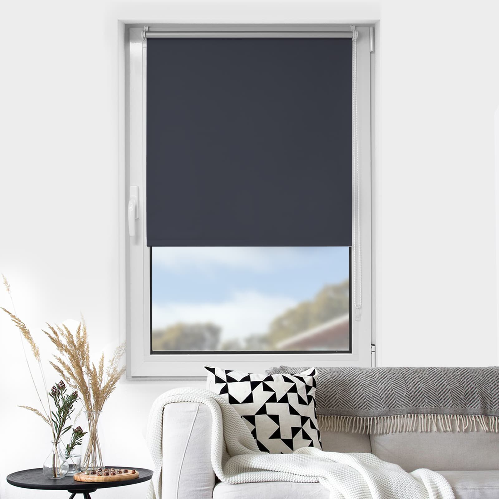 Der hochwertige Polyesterstoff ist blickdicht und mit einer speziellen Thermobeschichtung auf der Rückseite versehen. Diese reflektiert Sonnenlicht effektiv, reduziert Hitze im Raum und sorgt für vollständige Verdunkelung.
