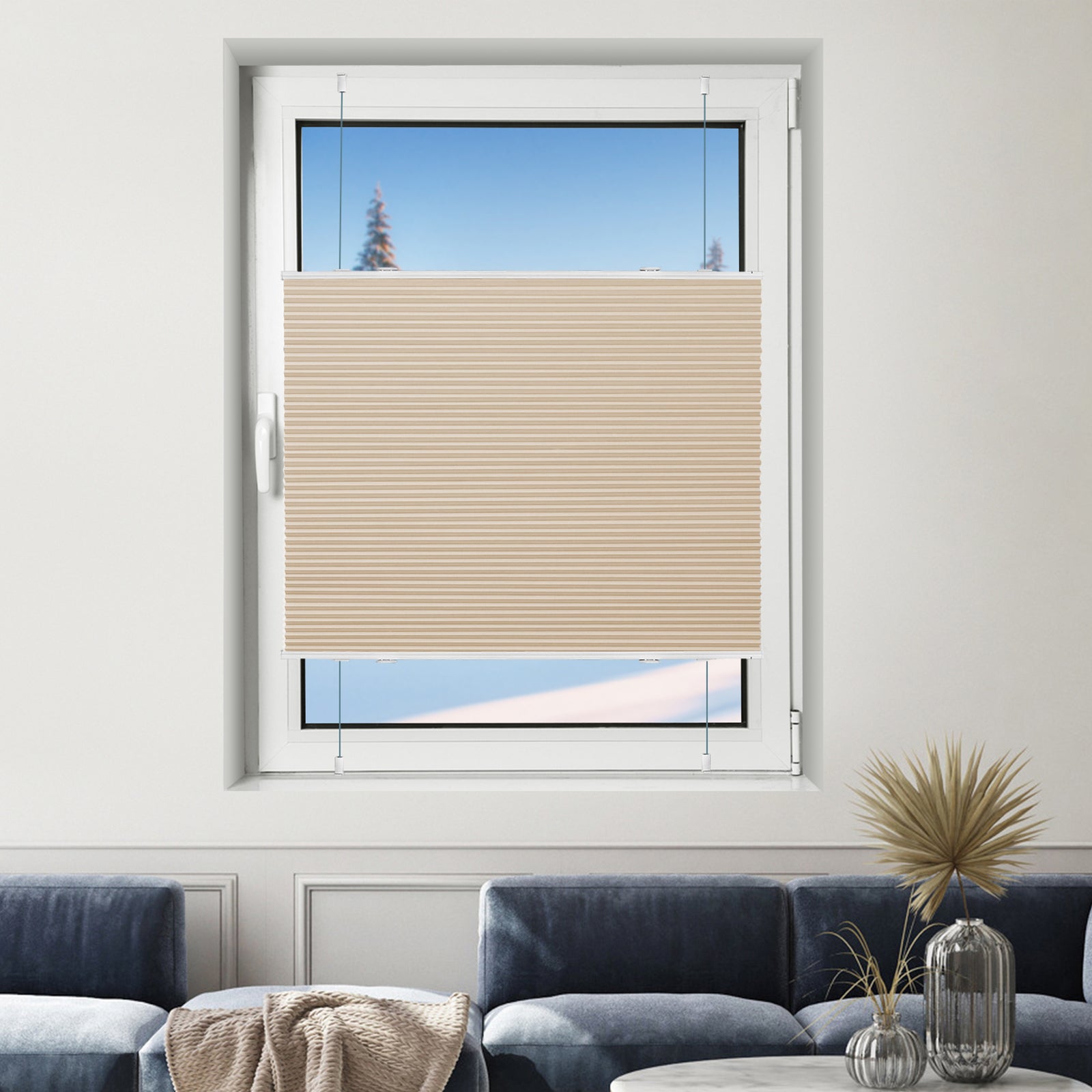 Das Wabenplissee kann ganz einfach mit klemmbaren Halterungen ohne Bohren am Fensterrahmen befestigt werden – ganz ohne Werkzeug. Alternativ ist auch eine Schraubmontage an der Wand möglich. Die Montage ist in weniger als 2 Minuten erledigt.